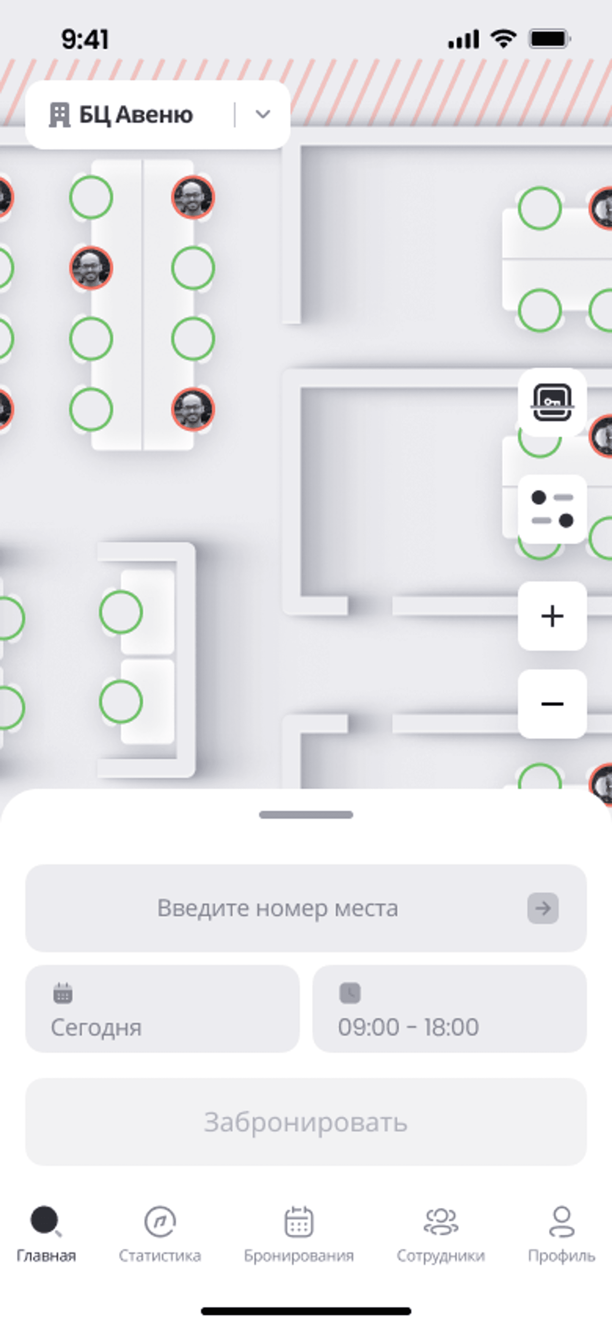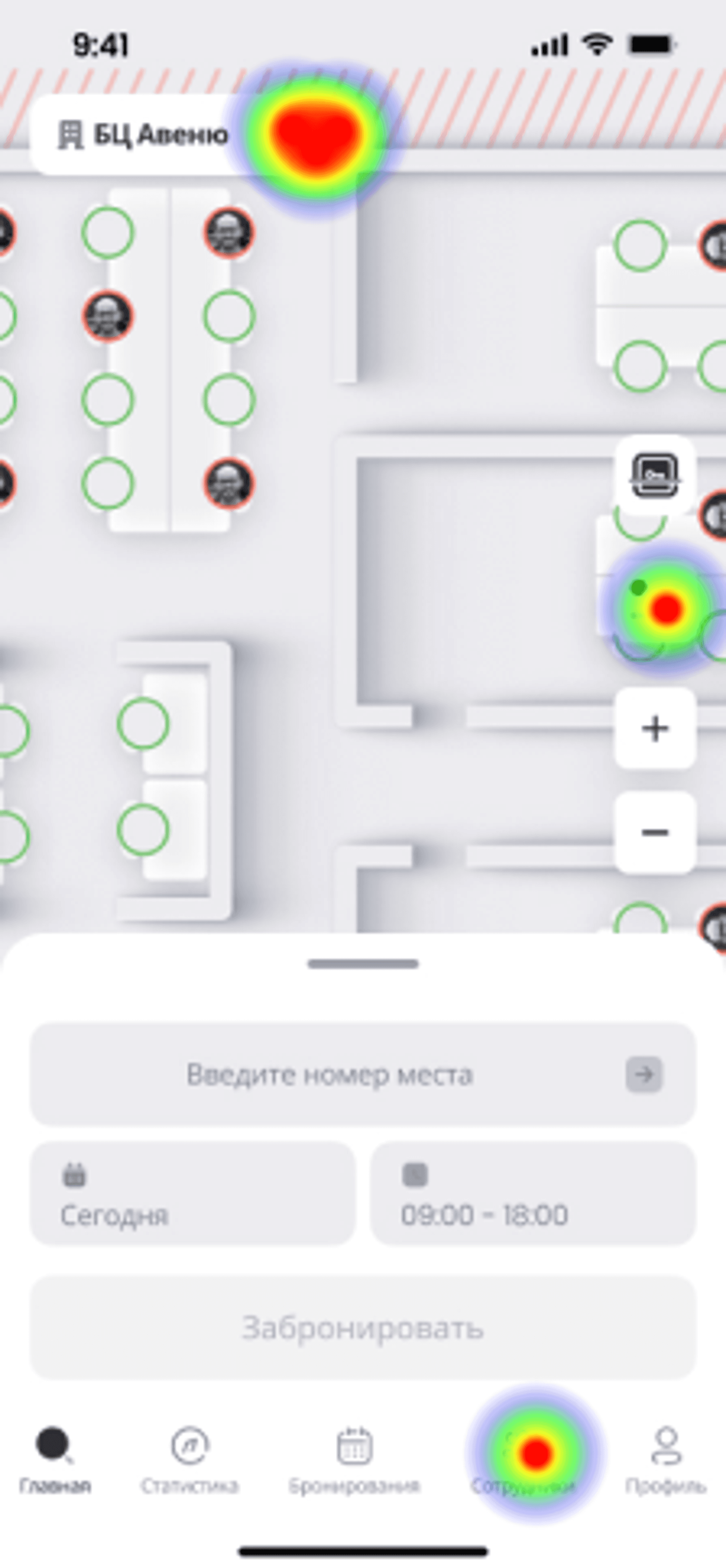 Респондентам был предложен главный экран, кнопка фильтров рабочих мест располагалась рядом с контролами карты. Кнопка выбора офиса была изменена
