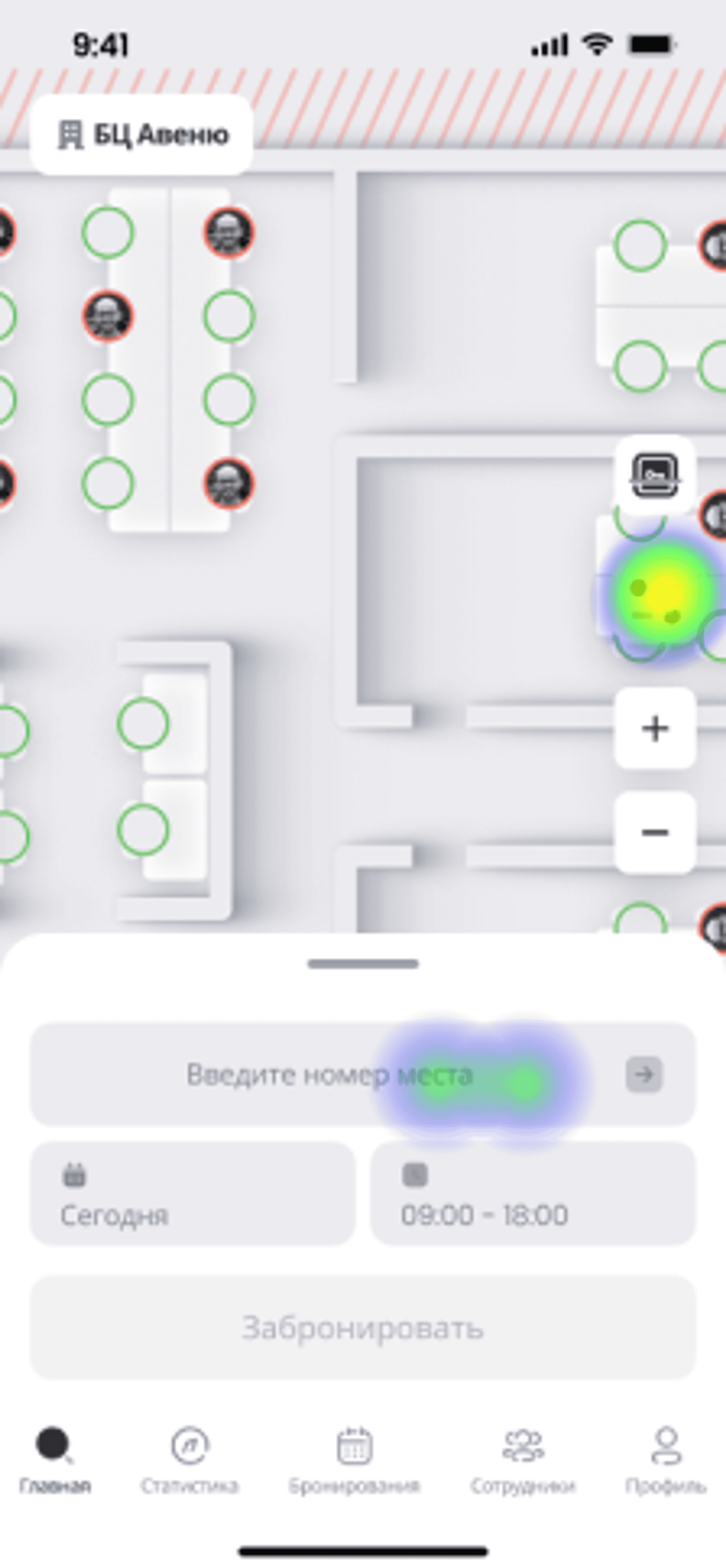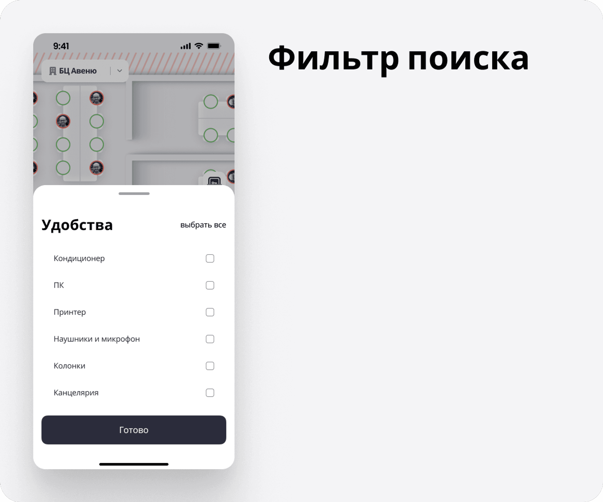 Перед вами карта офиса со всеми рабочими местами. Где вы нажмите, чтобы отфильтровать рабочие места?