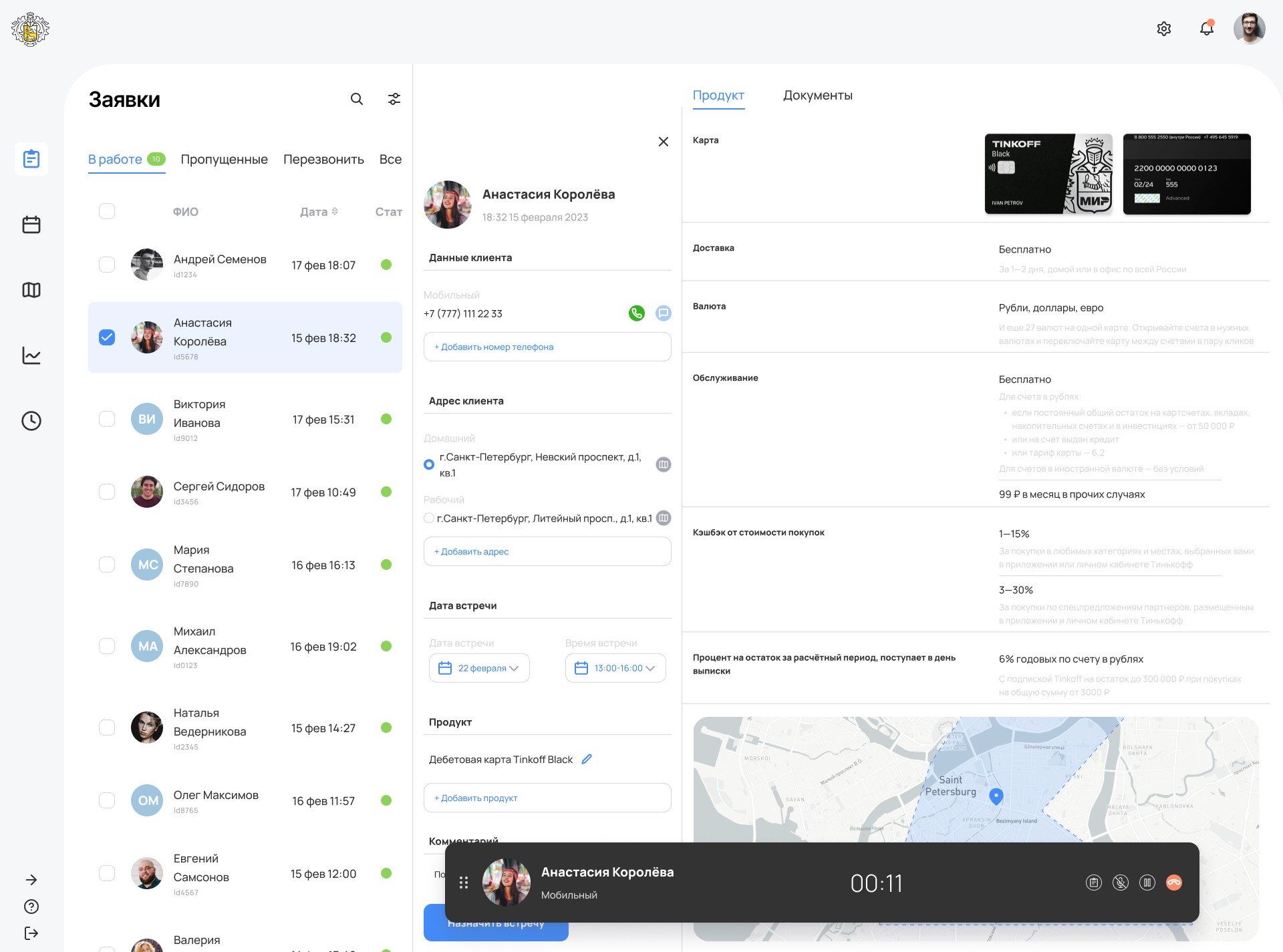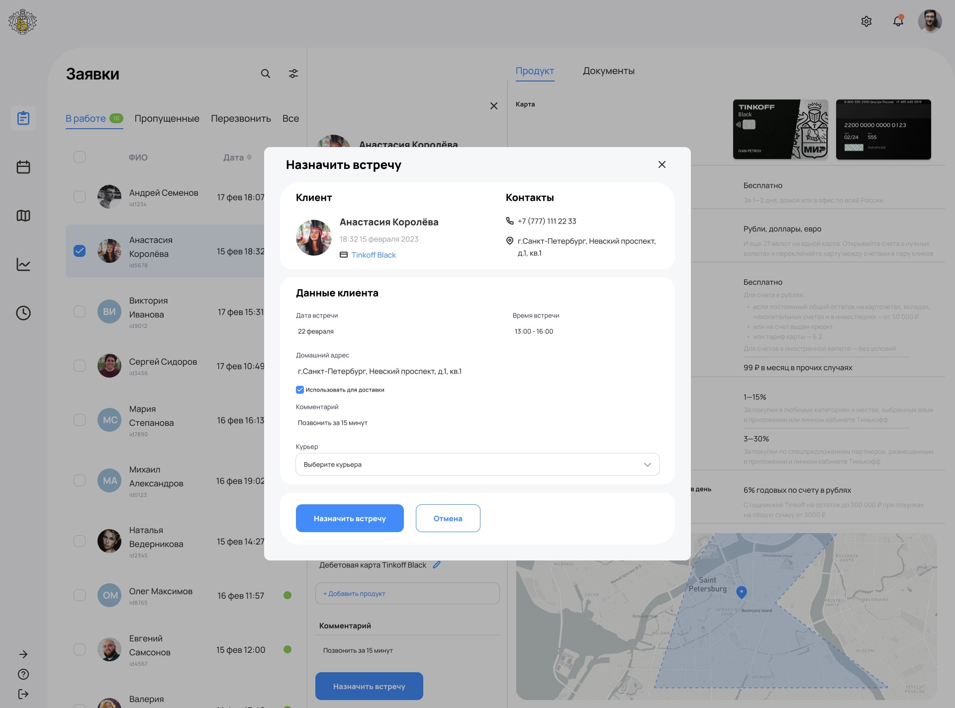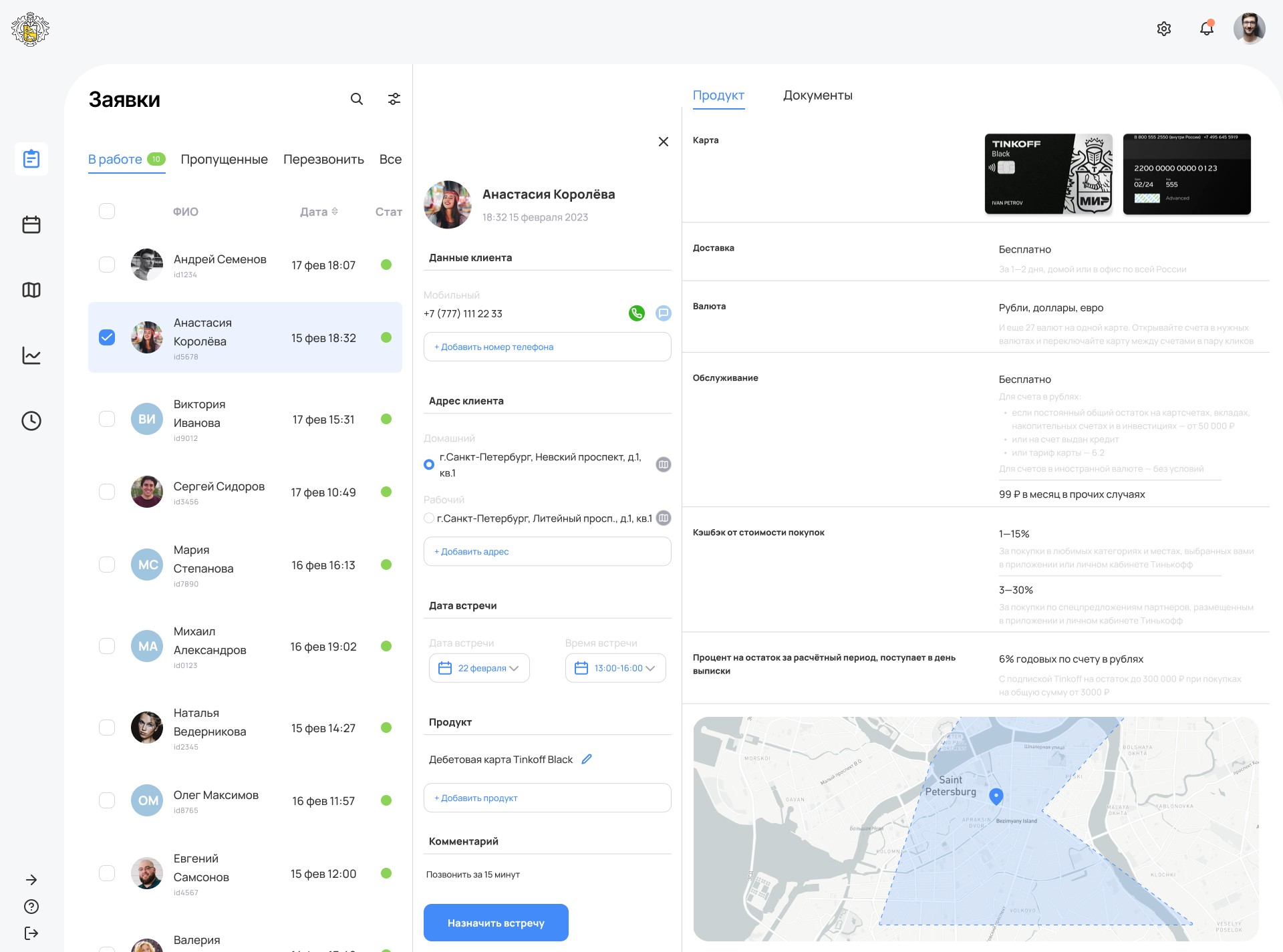 Цель была в том, чтобы создать удобный интерфейс для операторов колл-центра, который позволит им легко и быстро назначать встречи с клиентами, оставившими заявки на получение карты. Важно было учесть несколько ключевых функций: возможность консультировать клиента, просматривать и редактировать его адреса, а также управлять микрофоном во время разговора.