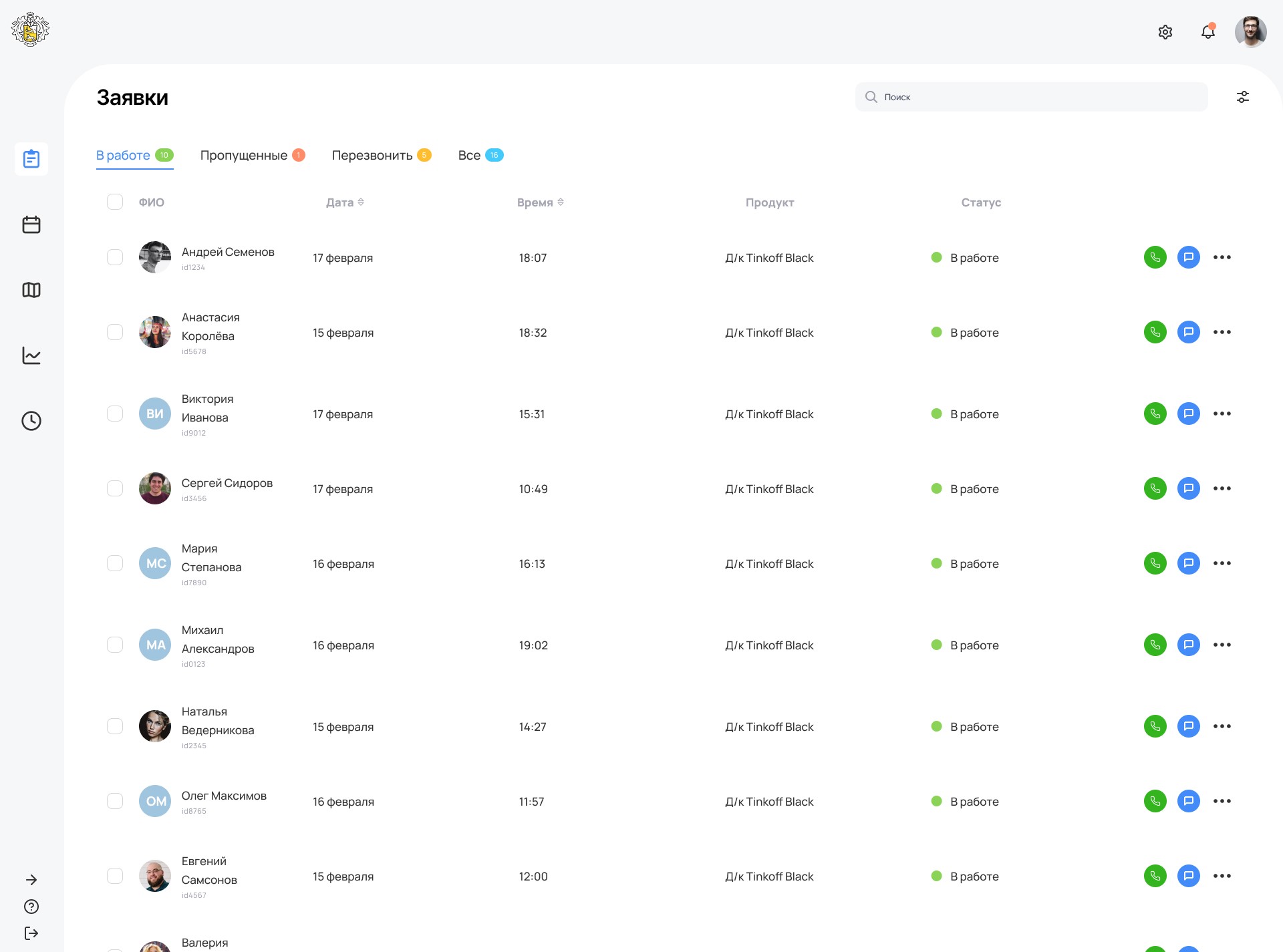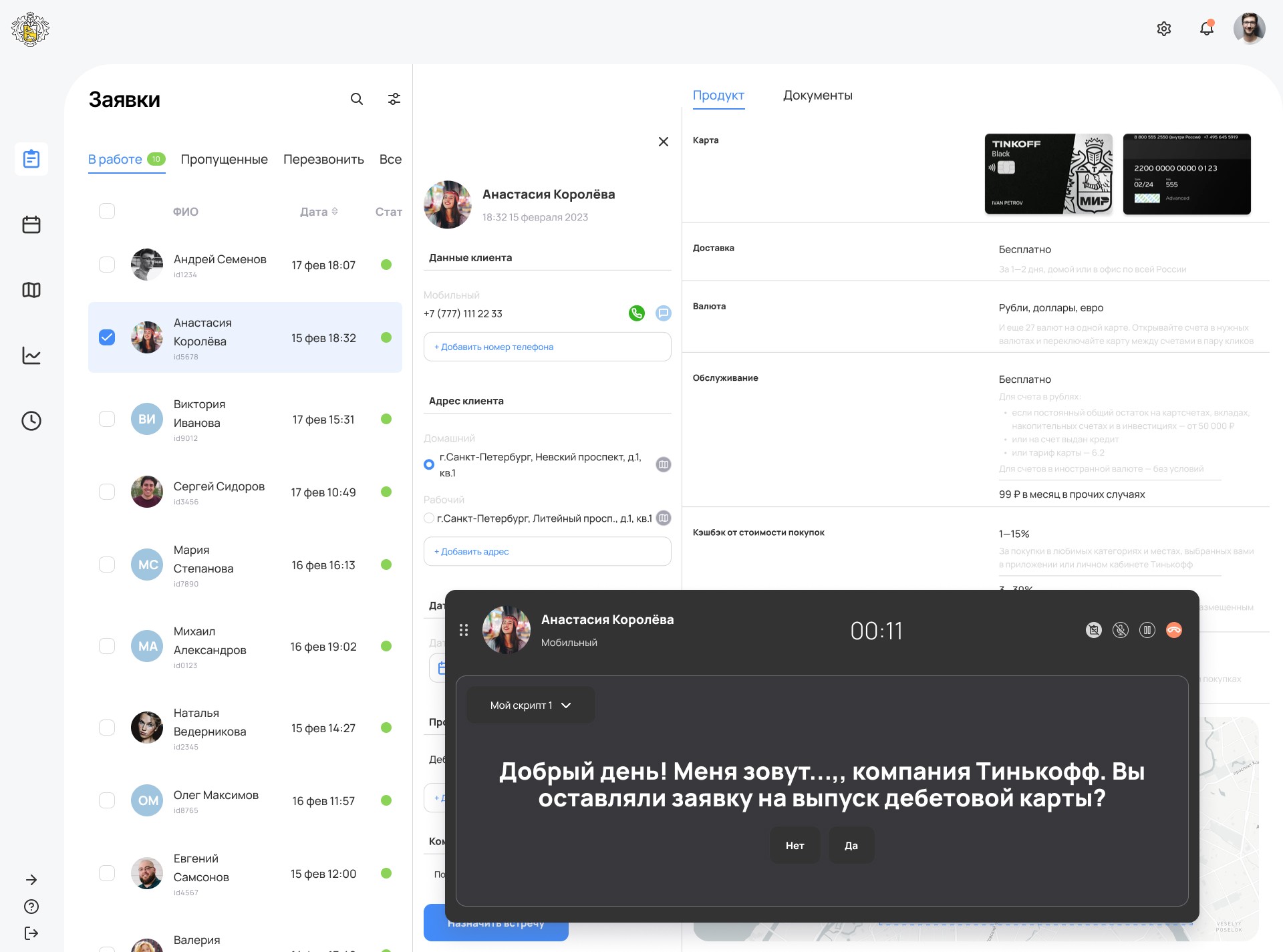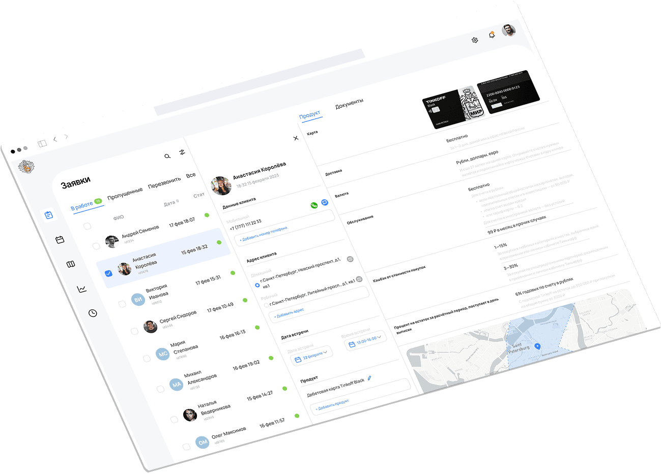 Цель была в том, чтобы создать удобный интерфейс для операторов колл-центра, который позволит им легко и быстро назначать встречи с клиентами, оставившими заявки на получение карты. Важно было учесть несколько ключевых функций: возможность консультировать клиента, просматривать и редактировать его адреса, а также управлять микрофоном во время разговора.
