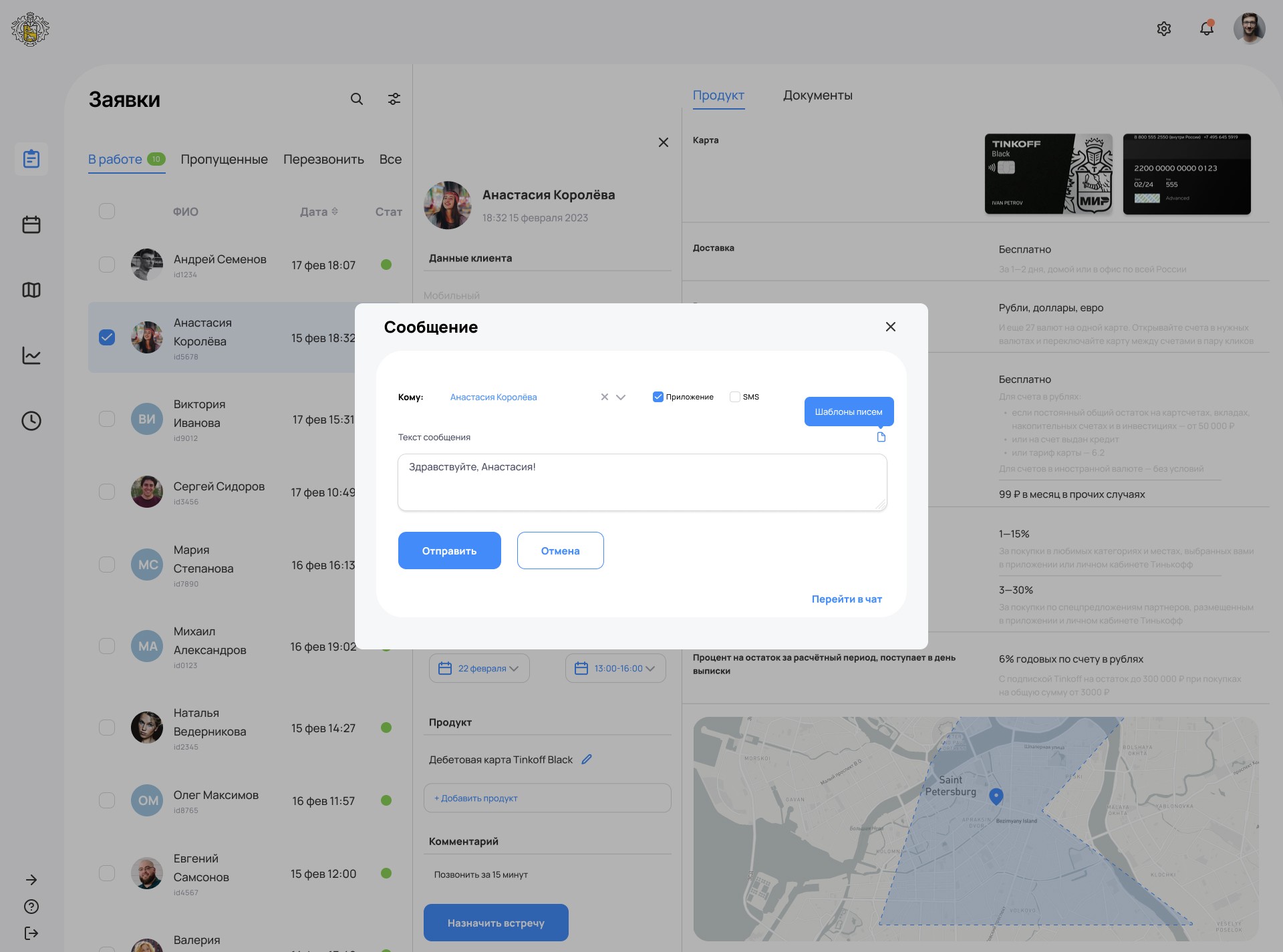 Так выглядит попапы с возможностью отправки сообщений клиенту и попап для назначения встречи. Оператор может сверить данные, которые ввел во время звонка, и сразу назначить курьера.