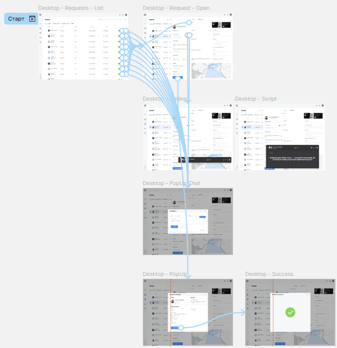 Сделал прототип для основного сценария назначения встречи. Можно потыкать и посмотреть, как всё работает на практике — от списка задач до назначения встречи. Все элементы интерактивные, так что можно понять, как будет ощущаться интерфейс, когда оператор реально начнёт им пользоваться