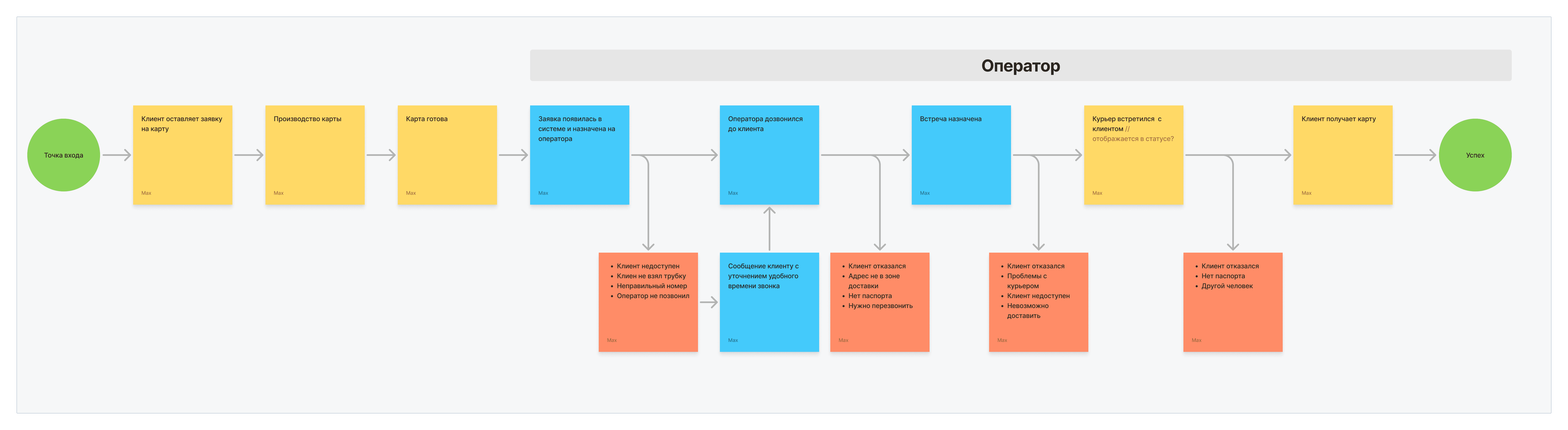 Когда работал над CJM, старался смотреть на задачу шире: понять все процессы, которые проходят за рамками интерфейса, и кто в них участвует. Я также обозначил ограничения, которые могут помешать пользователю следовать по пути, и добавил шаги, возвращающие пользователя обратно в сценарий. В процессе определил возможные действия на пути пользователя и выделил те шаги, которые относятся именно к интерфейсу
