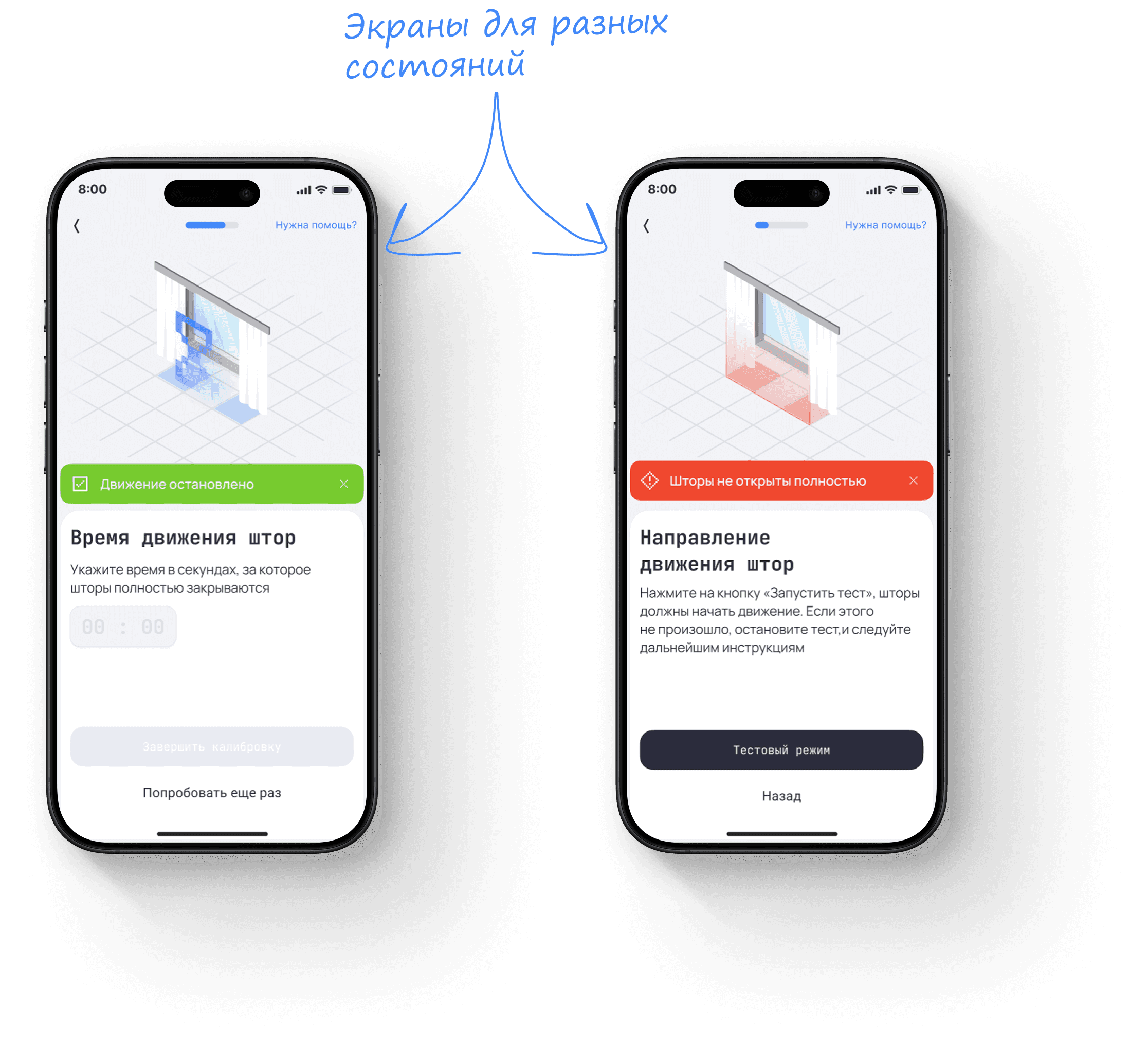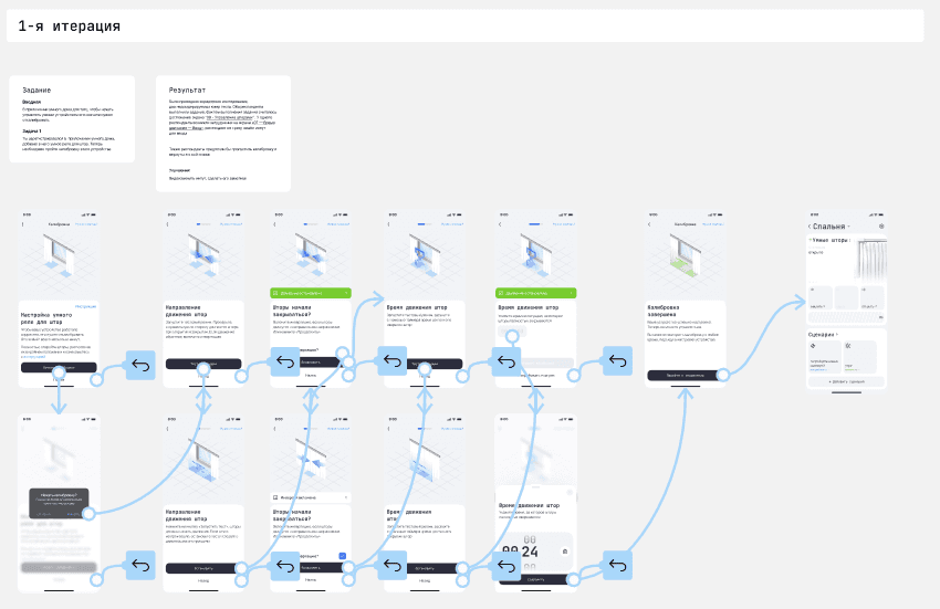 — Создал вайрфреймы для ключевых экранов: шагов калибровки и управления шторами
