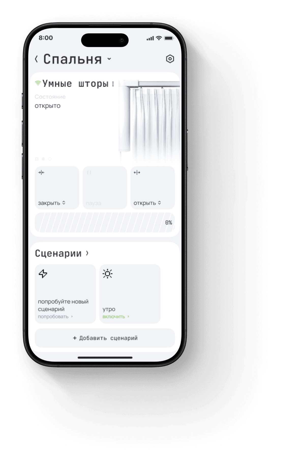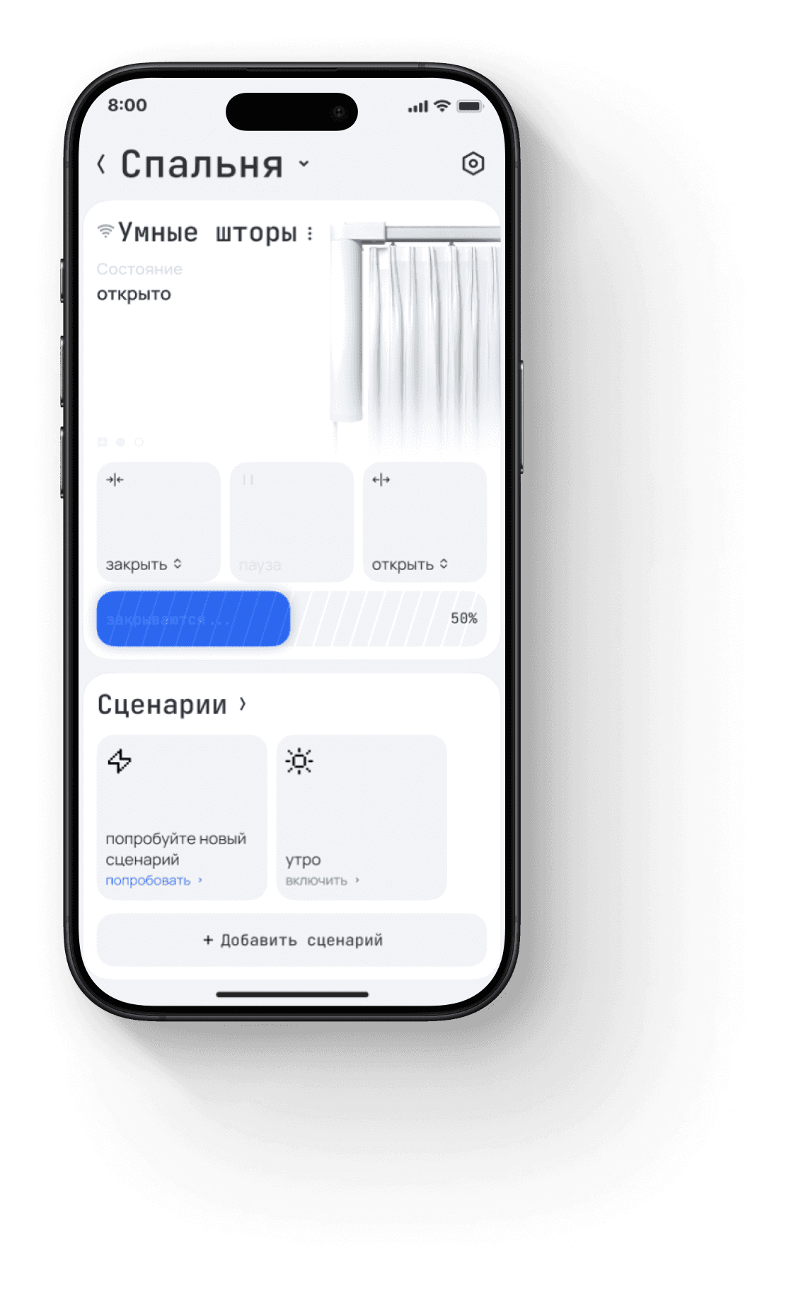 После добавления и калибровки реле, пользователь может попасть на главный экран устройства. На главном экране пользователь должен иметь возможность устанавливать степень открытия штор, а также настраивать сценарии автоматической работы.