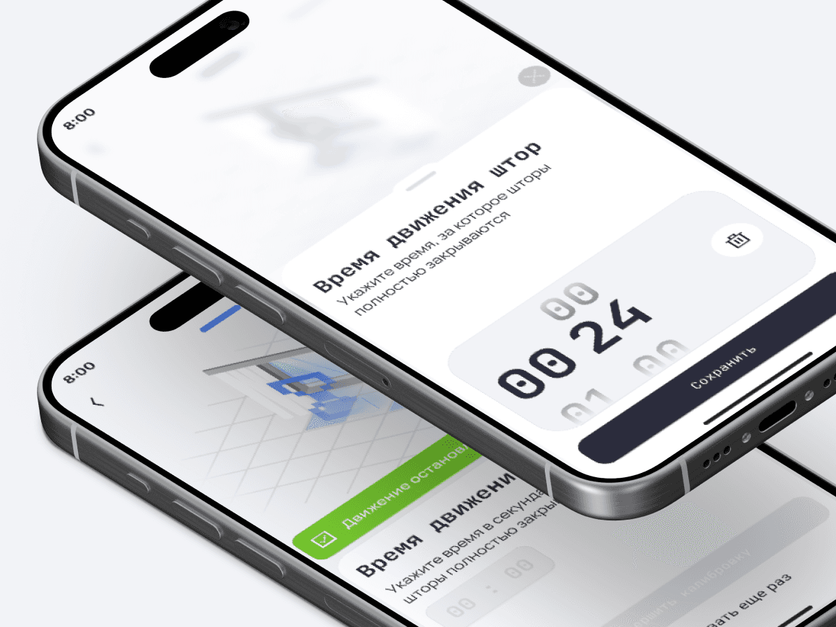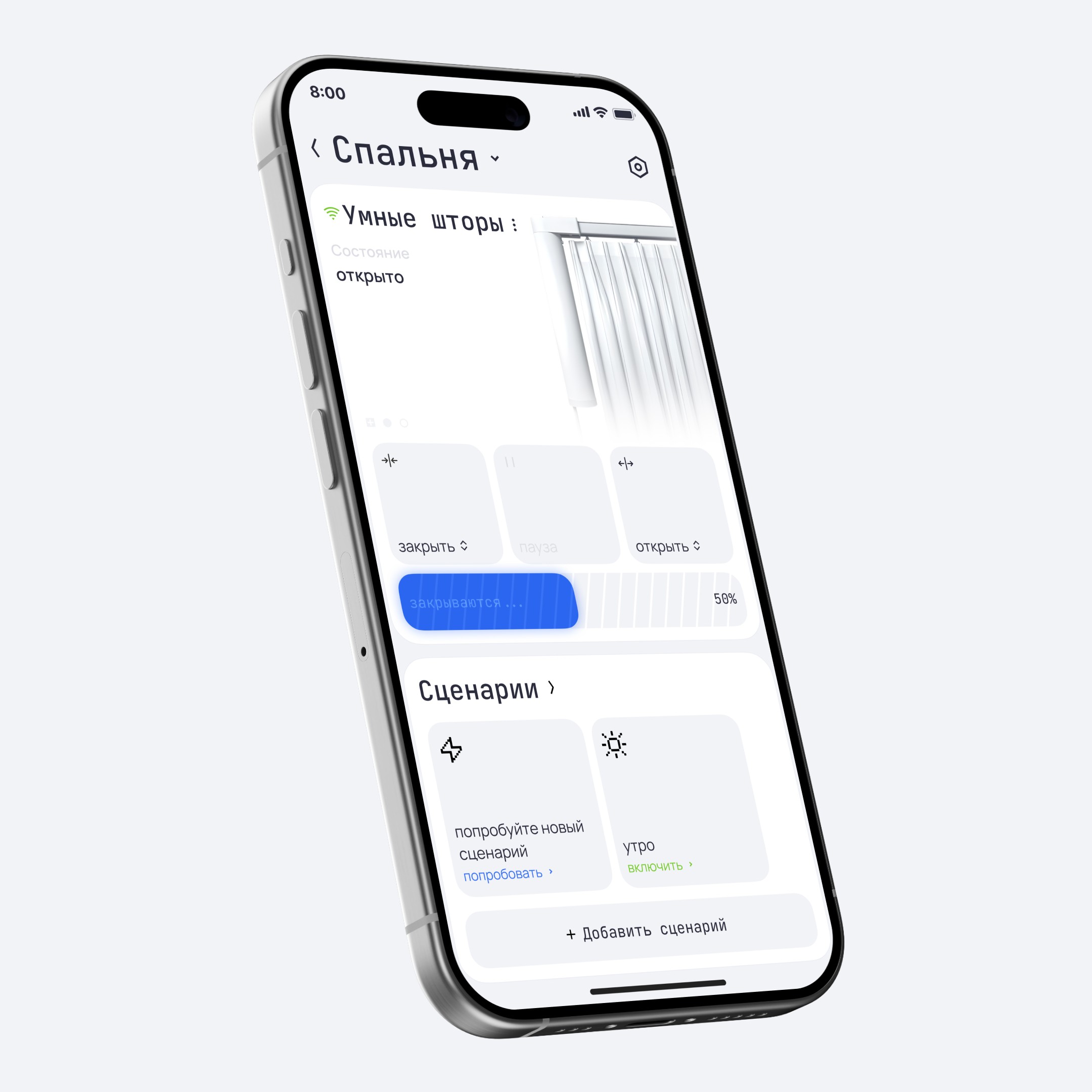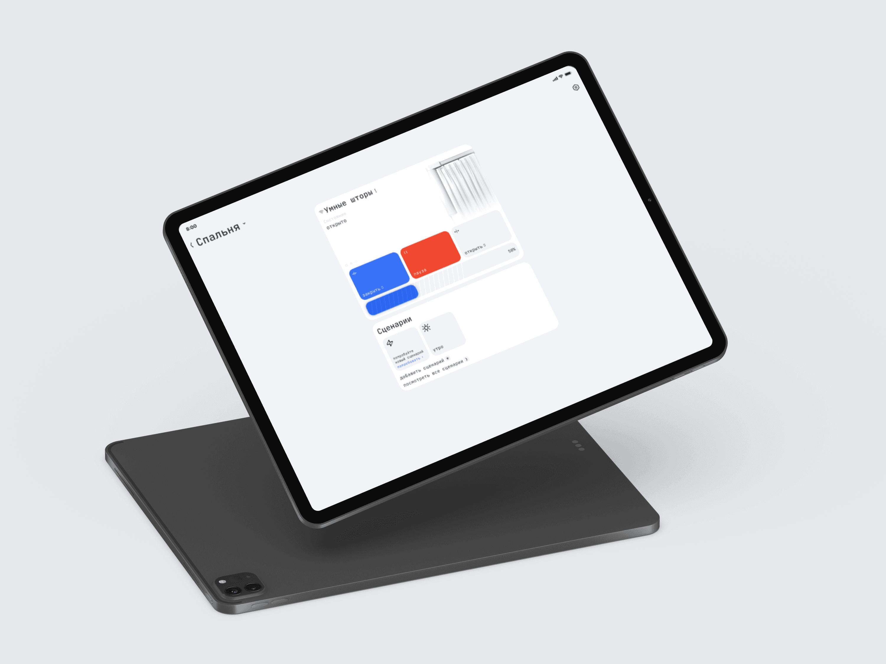 Для экрана управления шторами создал несколько концепций дизайна. В итоге собрал финальную версию, объединив лучшие элементы из разных подходов. Затем на основе этой версии задизайнил остальные экраны приложения