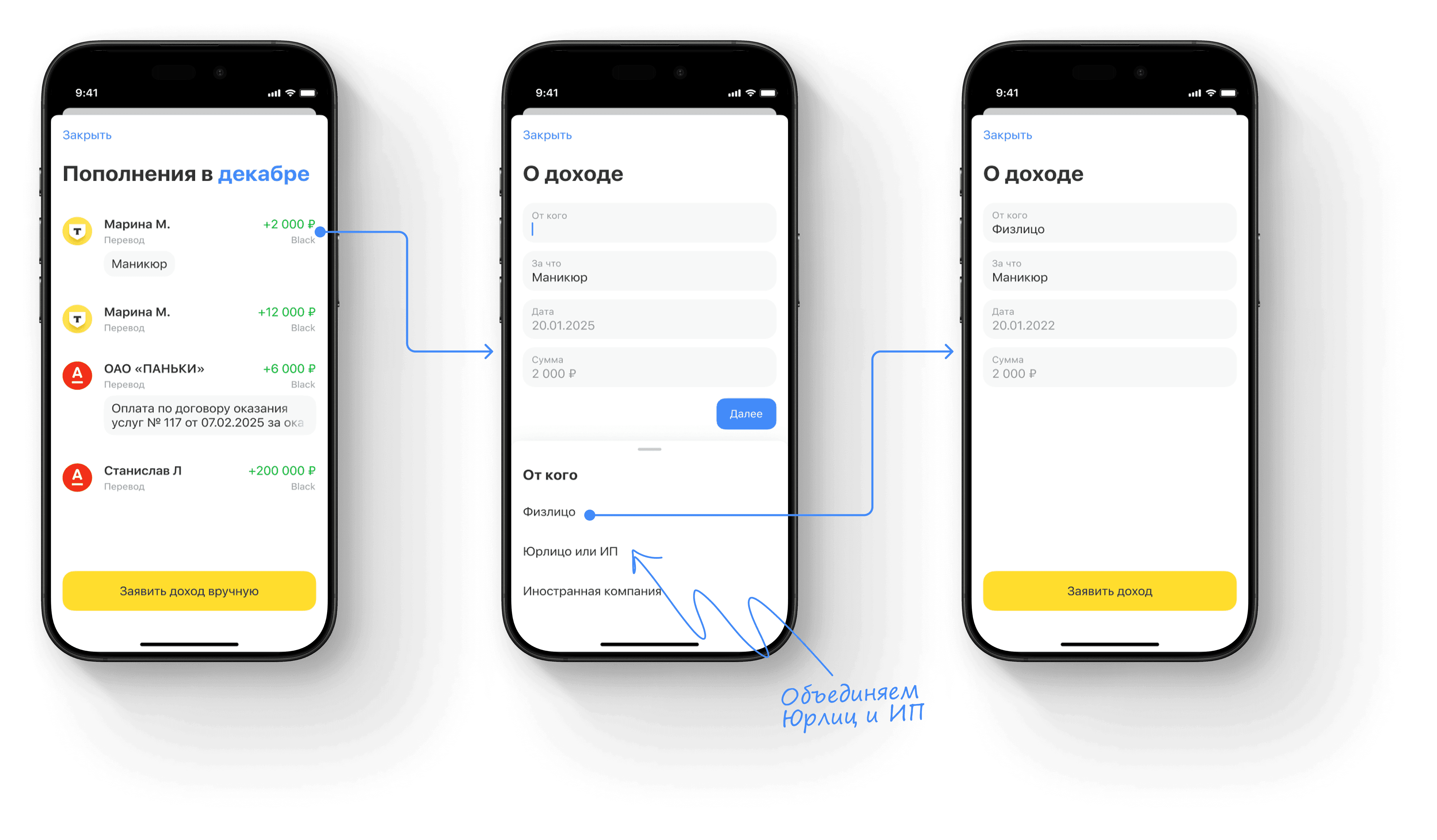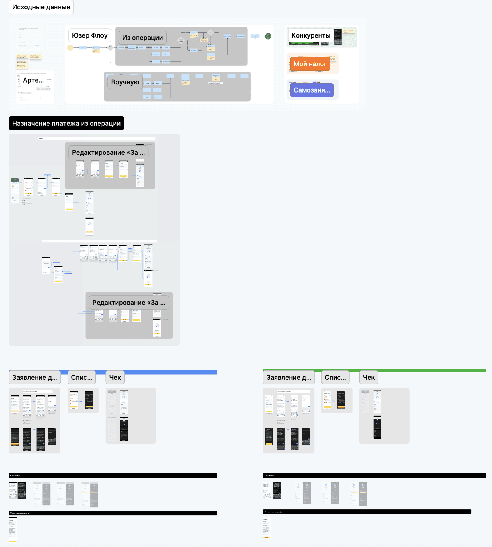Дальше — ресерч. Я не ограничивался только конкурентами, посмотрел обратную связь от пользователей, посмотрел, в каких программах работаю бухгалтеры, как учитывают чеки от самозанятых. Почитал законы, чтобы не заложить в интерфейс решение, которое потом развалится из-за юридических нюансов