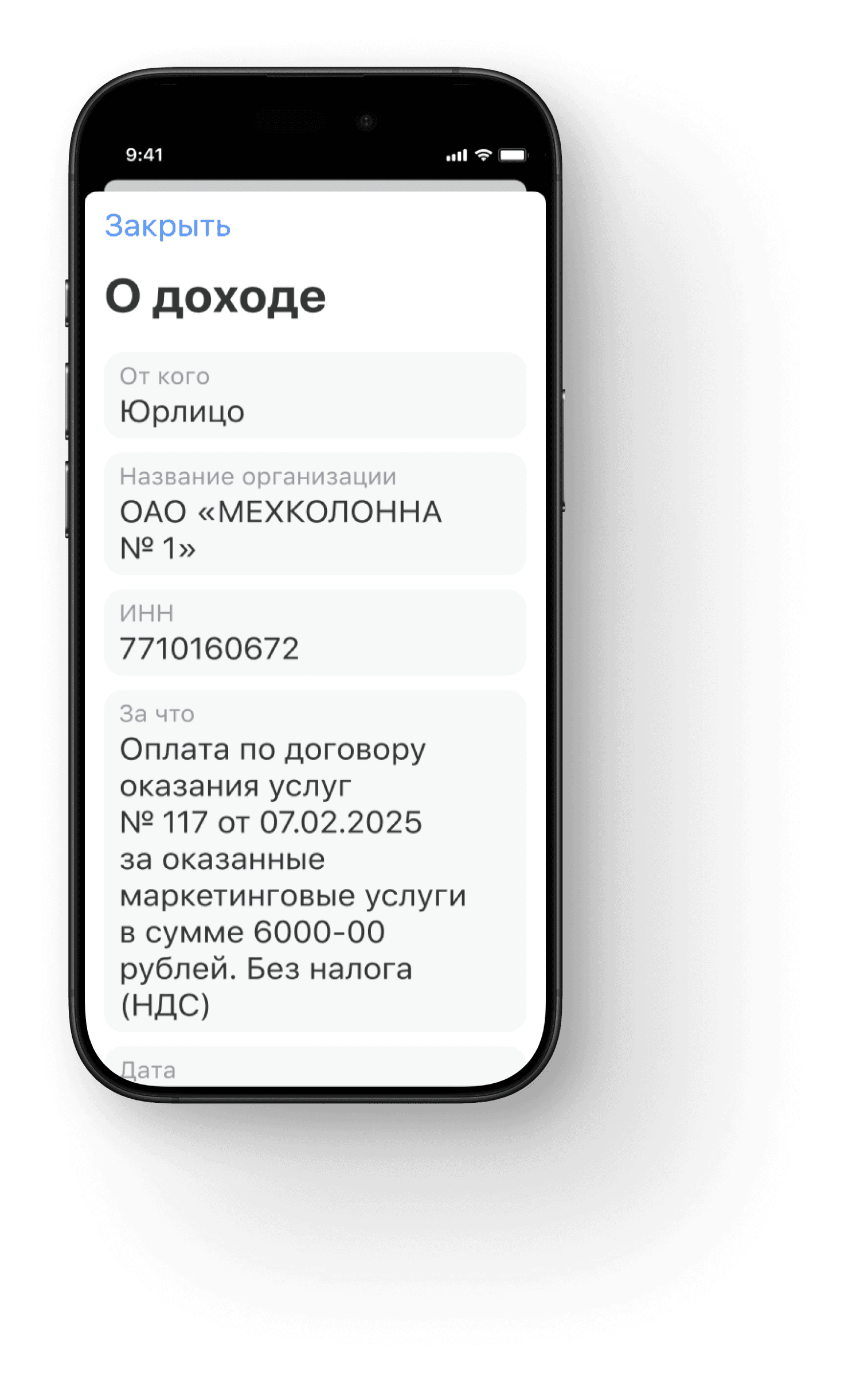 В сценариях физлиц и юрлиц были небольшие отличия. При получении средств от физлица, после нажатия на эту операции в ленте доходов, если у этой операции есть комментарий , открывается форма заявления дохода, в которой в поле «За что» подставлены все данные