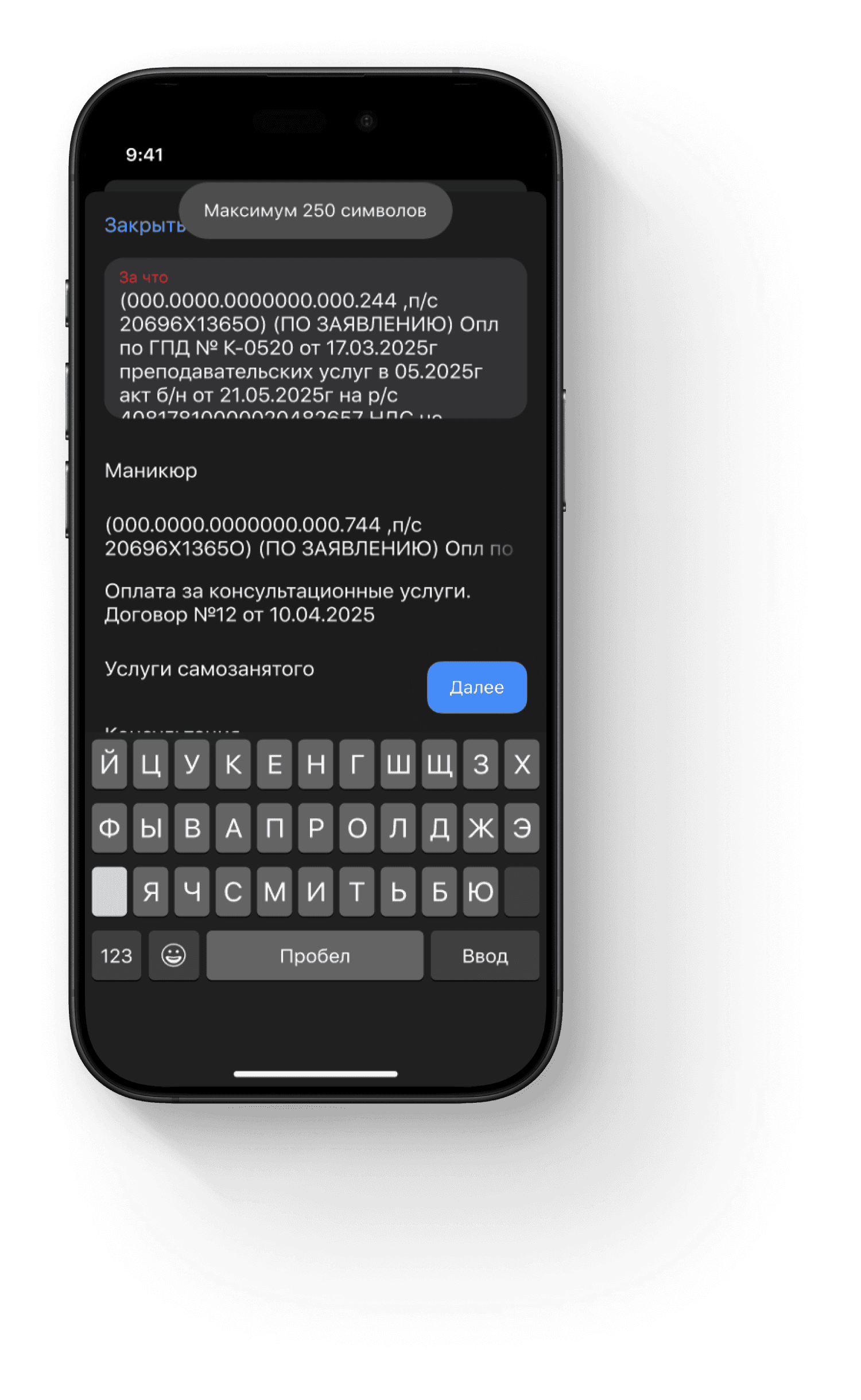 У пользователя есть возможность отредактировать поле «За что». Для этого нужно нажать на само поле, тогда появятся 10 подсказок, первые подсказки в списке будут из последних чеков, последние в списке будут базовые подсказки (если было меньше 10 чеков)